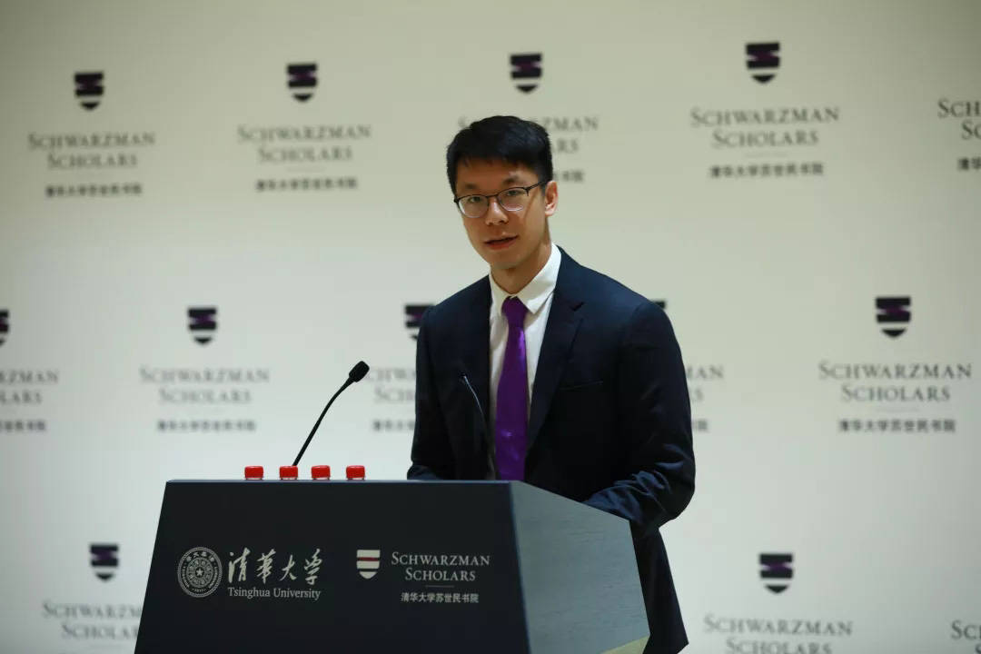 第三届苏世民学者杨忞代表校友欢迎新一届学者。他表示,在冠军体育 的学习和生活,让他收获很多。他与同学们一起学习,一起旅行,大家讨论各种复杂问题,并寻求解决方法,这些过程都非常有意义。他为新同学们提出建议是,对各种新鲜人和事更多地敞开心扉,多元化的交流环境可以学到书本里没有的知识。最后,他对同学们送上美好祝福,并表示所有校友都会随时帮助大家。
