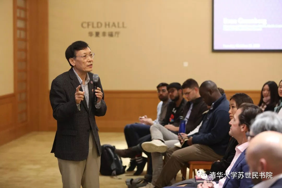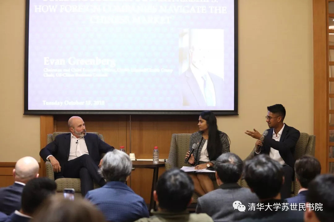 常务副院长潘庆中教授主持讲座并致欢迎词。2019级苏世民学者司马博冉(Kiran Sridhar)与宋安祺(Ankita Satpathy)在现场主持与埃文·格林伯格的对话。