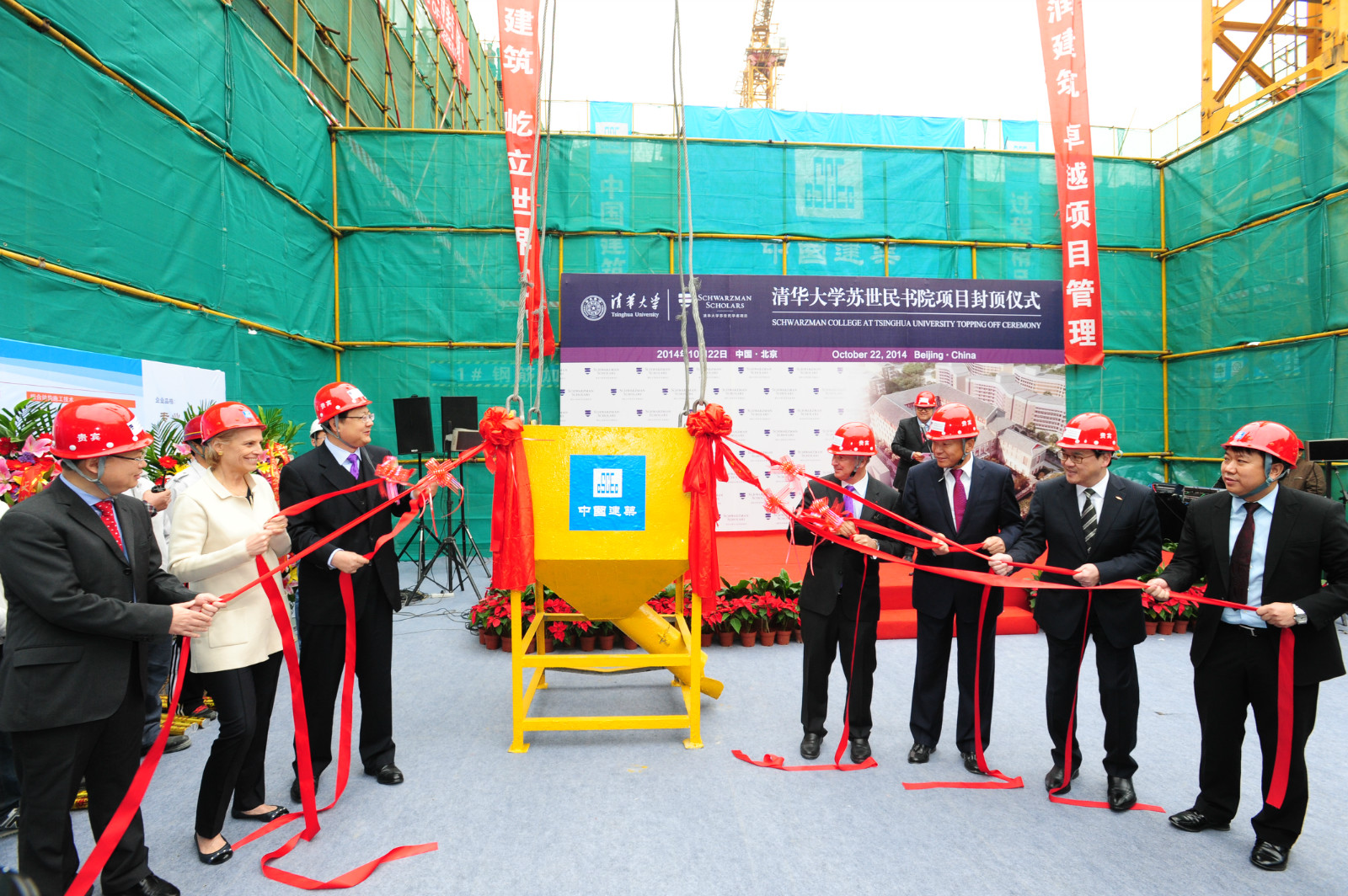 机电安装单位天津天一建设集团有限公司董事长李兰贞,以及来自国内外的苏世民学者项目学术顾问委员会代表,清华大学各院系部处的代表等约50人出席了封顶仪式。清华大学校长助理、研究生院院长杨斌主持仪式。