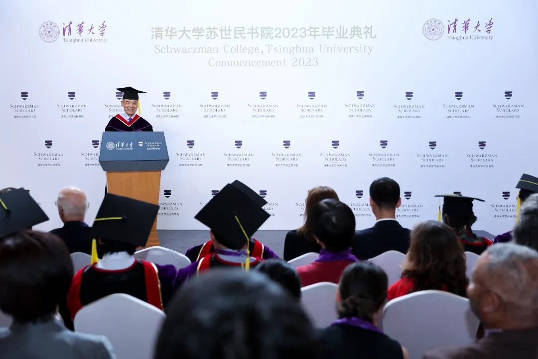苏世民(Stephen A. Schwarzman)以视频的形式向毕业生们表示了祝贺,并感谢清华大学领导对书院自启动以来给予的支持和帮助。他表示,今年3月来到书院,很高兴聆听第七届苏世民学者在中国经历的难忘瞬间,大家积极投身于课程、研究和社交活动,亲身感受中国的变革与发展。苏世民对同学们在面对未知时展现出的沉着和好奇心表示赞赏,并希望大家将所学、所悟带到未来的人生旅程中。苏世民强调,书院的成功不仅在于学者们的优秀表现,更在于大家将所学的理念和价值观运用到日后的职业生涯中,成为引领世界变革的力量。他希望毕业生们保持全球视野,勇敢追求梦想,并通过合作与合力解决全球性挑战,为世界的未来做出积极的贡献。
