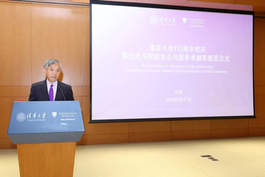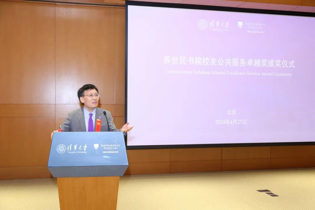 薛澜对首届公共服务奖的颁布表达了祝福,并欢迎校友回归。他表示,书院校友已超过900名,分布在80多个国家和地区,活跃在17个校友枢纽城市(hub cities)。今年是首次进行校友表彰,薛澜希望校友们可以继续参与公共服务,积极践行清华大学的校训“自强不息 厚德载物”。