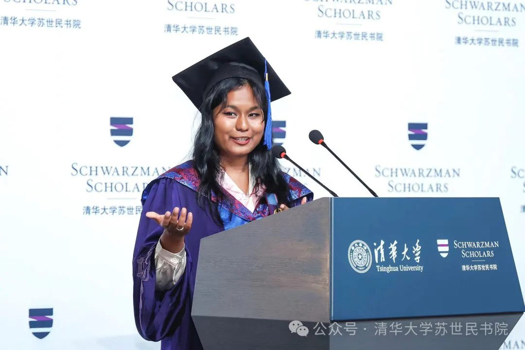 沈灵越(Samata Shrestha)深情地回顾这段充满学习、友谊、实践和无限机会的旅程。她在苏世民学者项目中与同学们建立了深厚的友谊,共同度过了许多难忘的时光。他们共同面对挑战,寻找解决世界问题的方法;他们互相学习彼此的文化和兴趣,体验探索多元文化的乐趣。沈灵越提到,在校园的象牙塔外,战争和暴力冲突肆虐,这需要所有人努力和改变。她强调感恩的重要性,表达对家庭和书院的感谢。最后,沈灵越期待与第8届苏世民学者一道,从书院出发,心存感恩,让世界变得更好。