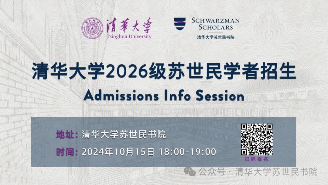 将于2024年10月15日举办一场线下宣讲会。本场宣讲会旨在为2026级苏世民学者申请人提供一个走进书院的机会,充分了解书院的教育理念、学术氛围、职业规划等关键信息,同时也可以与招生老师进行面对面交流,咨询申请准备过程中需要关注各个方面。由于活动名额有限,欢迎感兴趣的青年朋友们尽早报名参加。